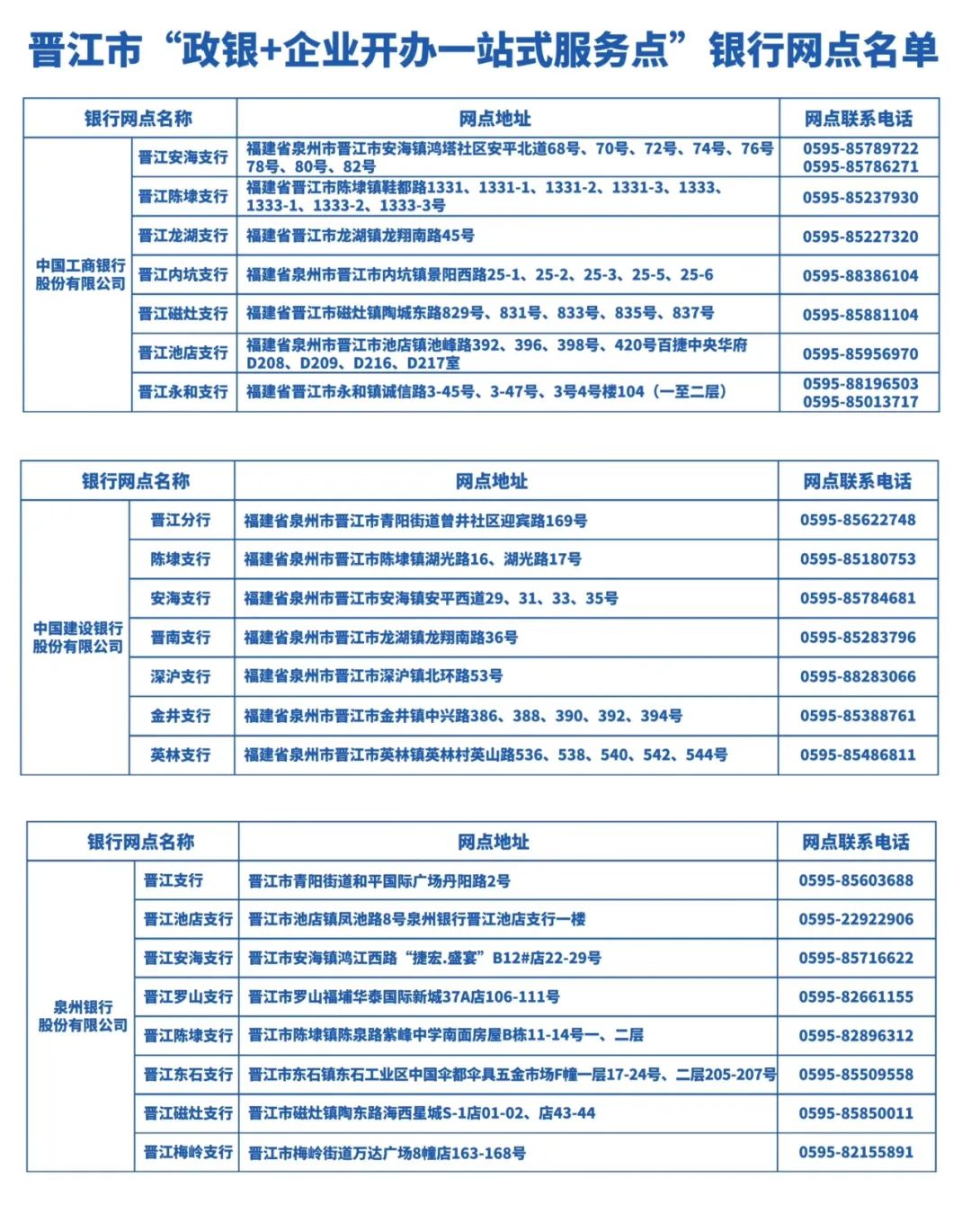 为深化政银合作、优化营商环境,晋江市市场监督管理局将行政审批服务触角向前延伸,与中国工商银行股份有限公司晋江分行、中国建设银行股份有限公司晋江分行、泉州银行股份有限公司晋江区域支行携手搭建“政银合作”新平台。