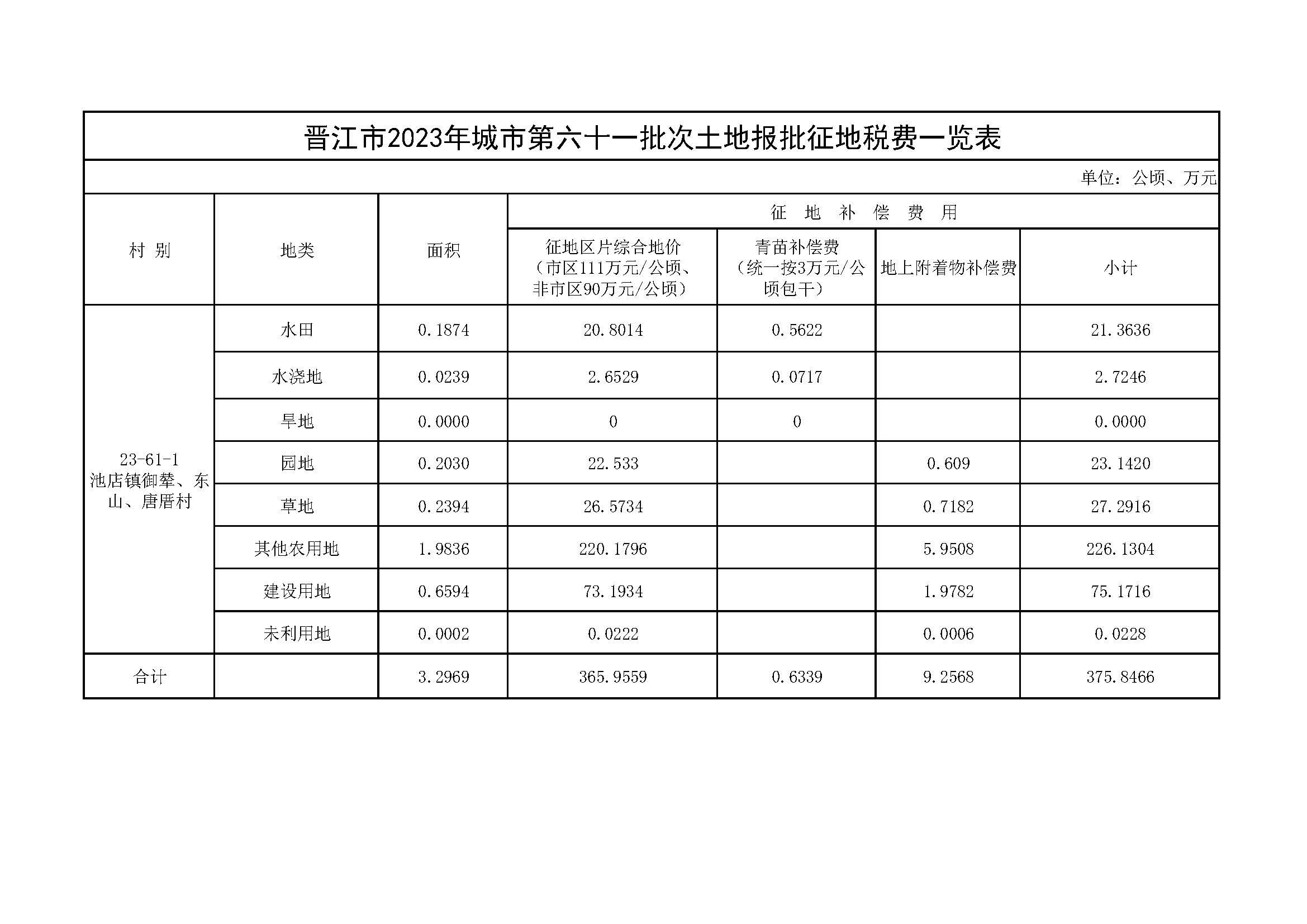 晋江市2023年城市第六十一批次土地报批征地税费一览表