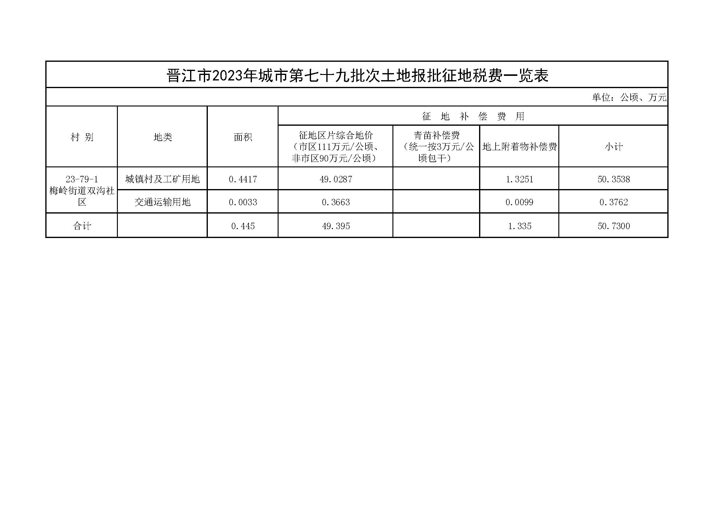 晋江市2023年城市第七十九批次土地报批征地税费一览表