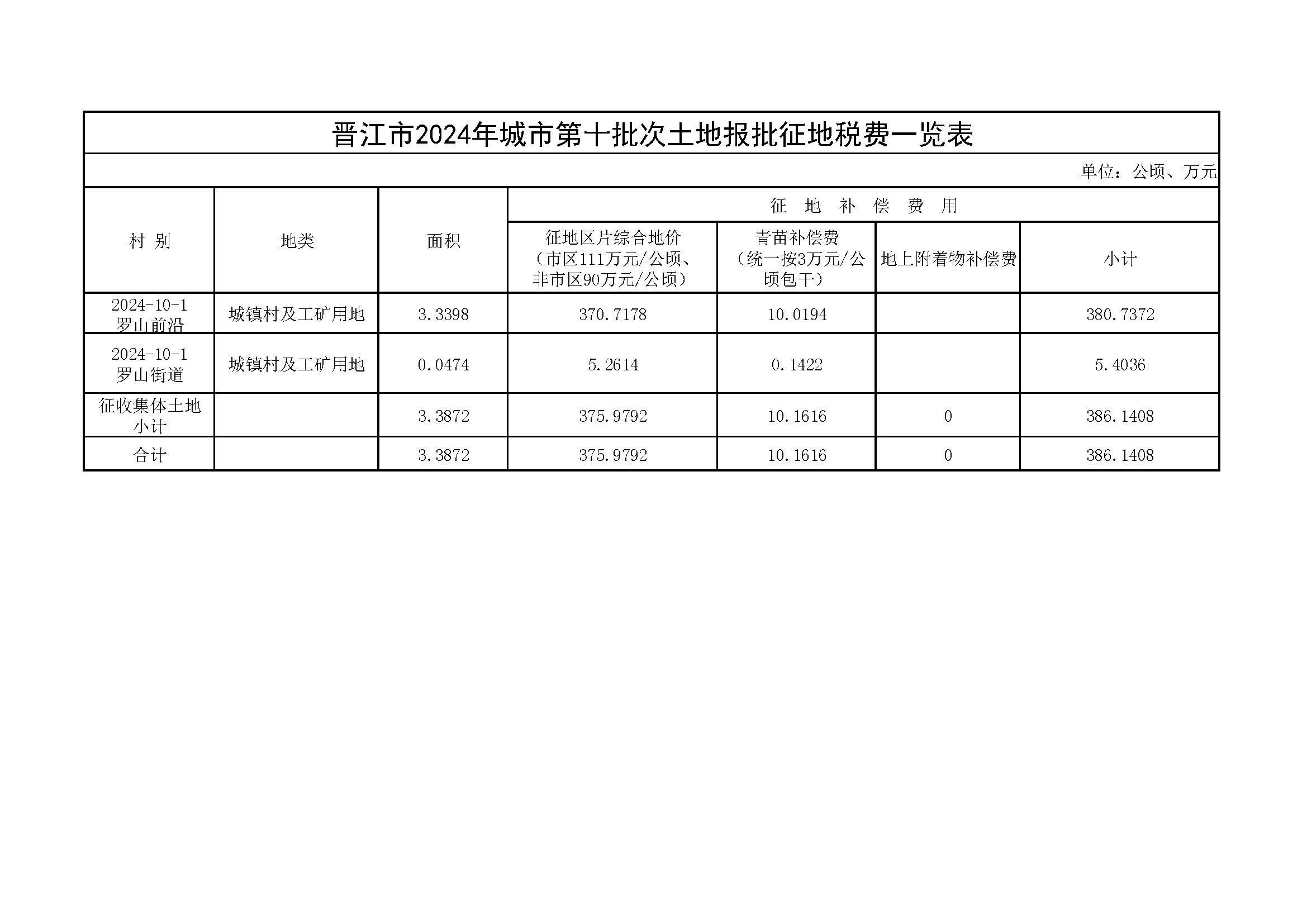 晋江市2024年城市第十批次土地报批征地税费一览表
