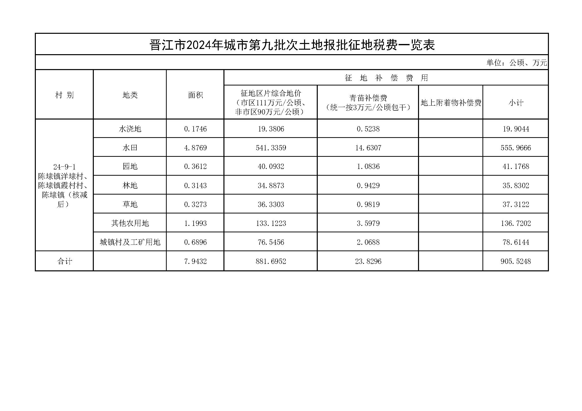 晋江市2024年城市第九批次土地报批征地税费一览表