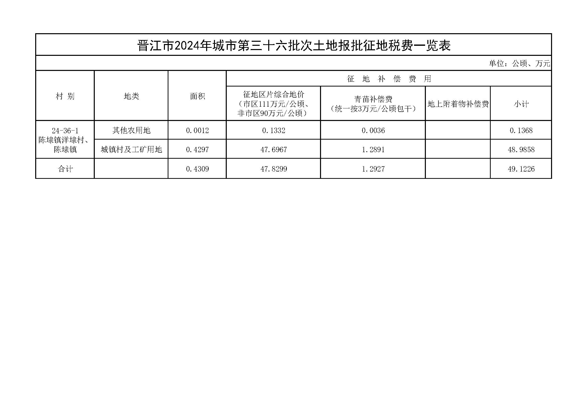 晋江市2024年城市第三十六批次土地报批征地税费一览表