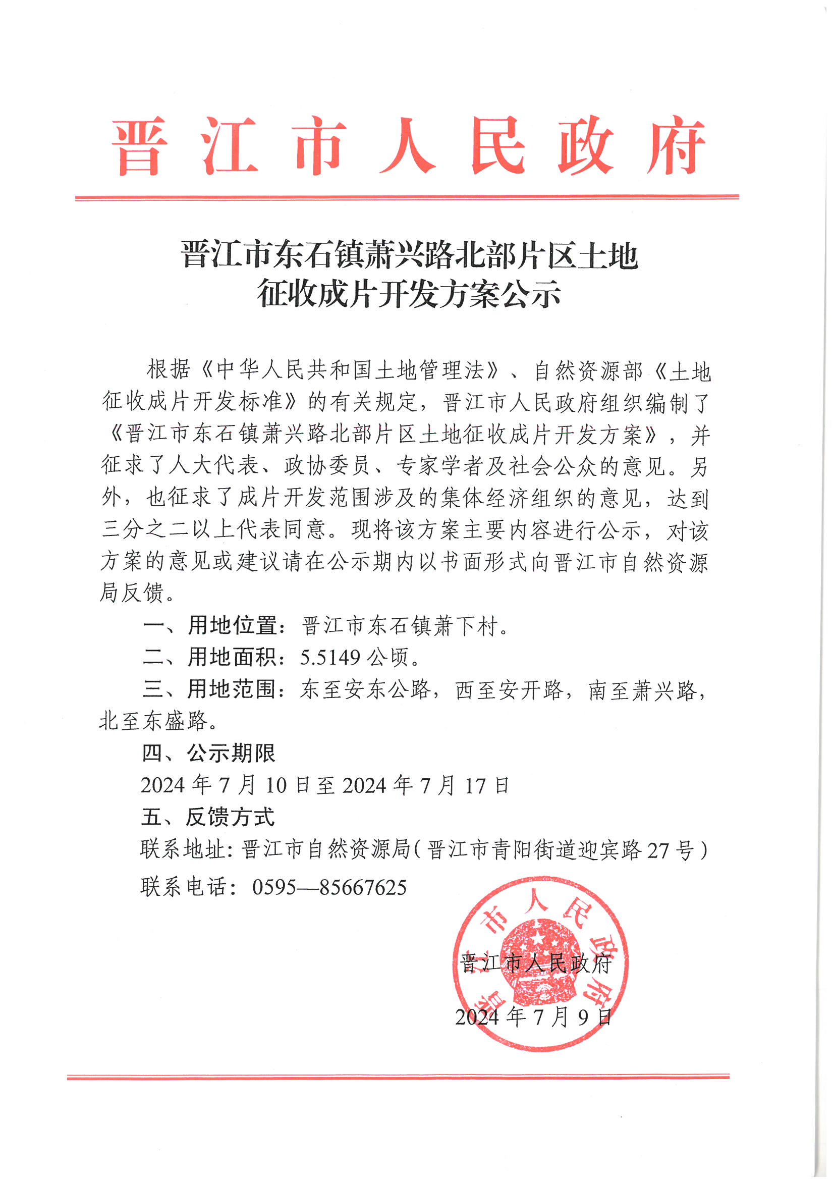 晋江市东石镇萧兴路北部片区土地征收成片开发方案公示