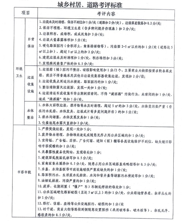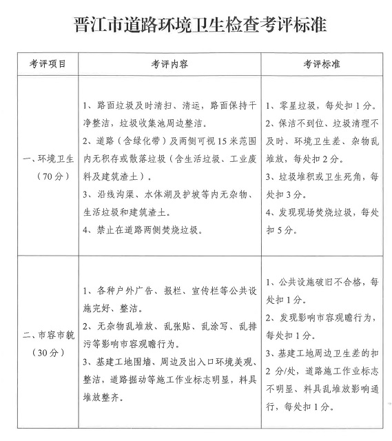 1.考评标准:以泉州、晋江市考评标准(《城乡、村居道路考评标准》、《城乡公厕考评标准》、《晋江市村(社区)环境卫生检查考评标准》、《晋江市道路环境卫生检查考评标准》、《晋江市农村公厕管理考评标准》,详见附件4-8)为准。上级若有修改考评标准,则随之更新。