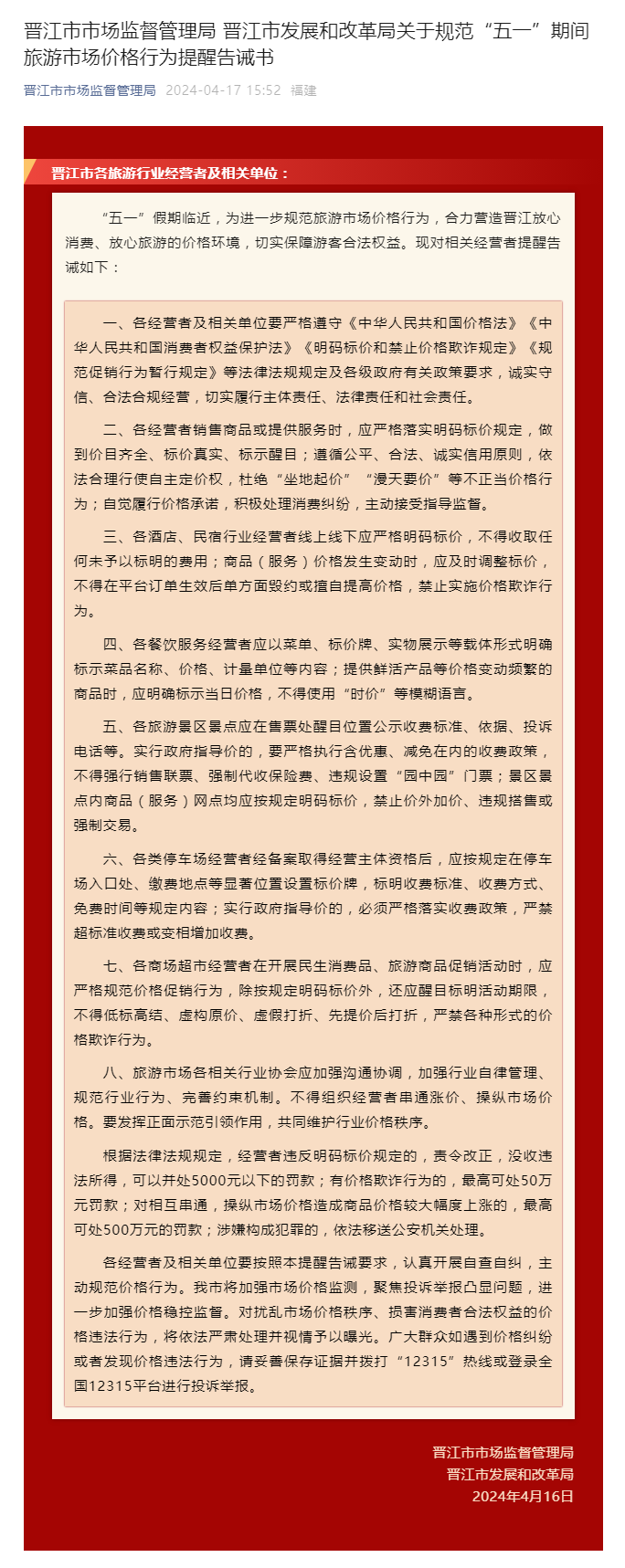 【消费提示】晋江市市场监督管理局 晋江市发展和改革局关于规范“五一”期间旅游市场价格行为提醒告诫书
