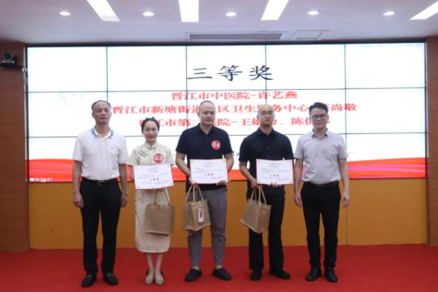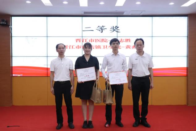 晋江市卫健局二级主任科员许辉荣、中医院党委书记陈文添为“二等奖”获得者颁奖